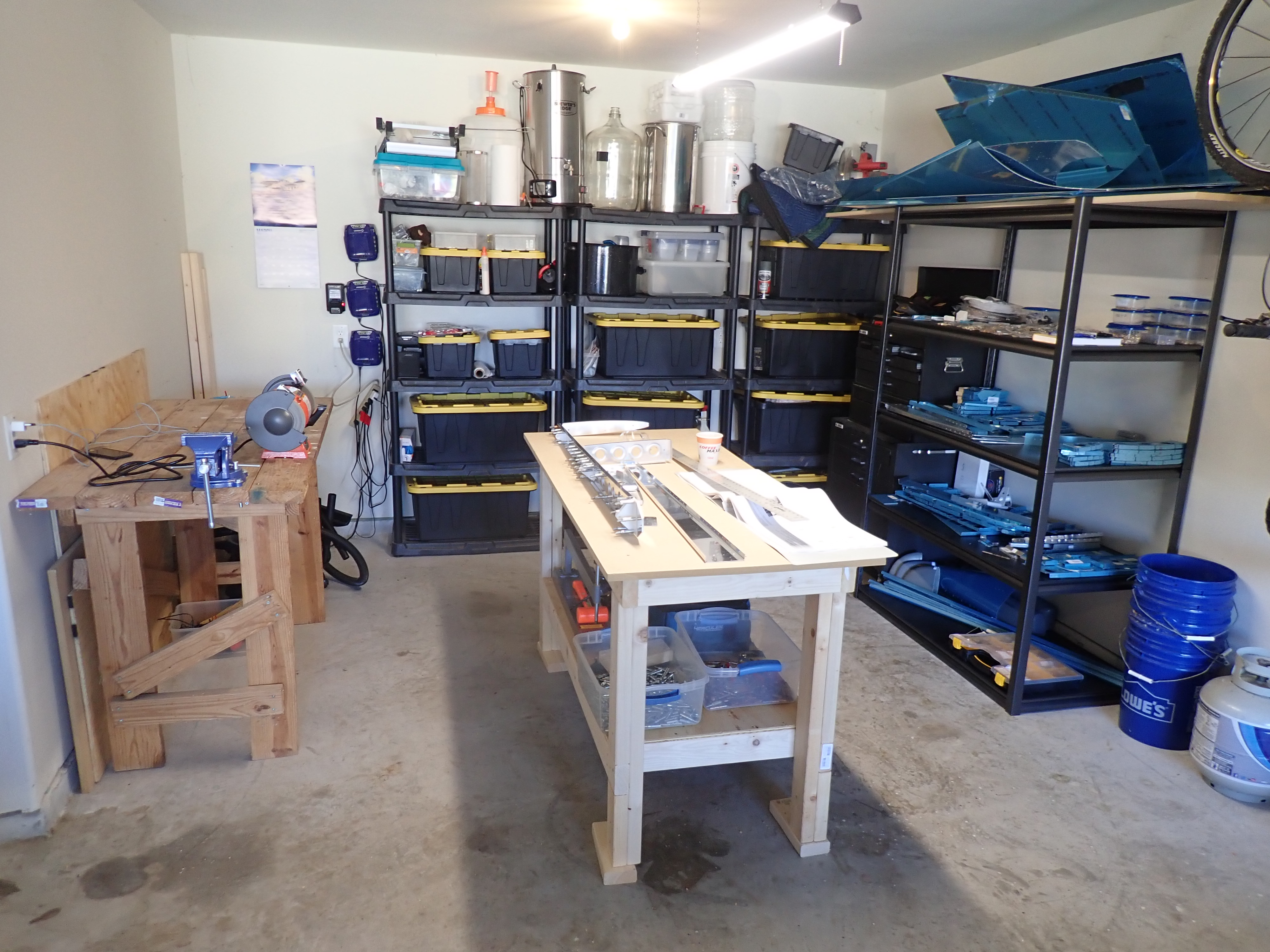 After a few months of organizing, thinking, planning, and getting rid of the useless, energy wasting garage fridge, I finally have a good space to work. I put together an “EAA Workbench” in order to do most of the work but I have enough wood to build another matching table when longer pieces require it. The workbench on the left is a hold over from the old house, and it is a rickety POS bench compared to the new one I made.