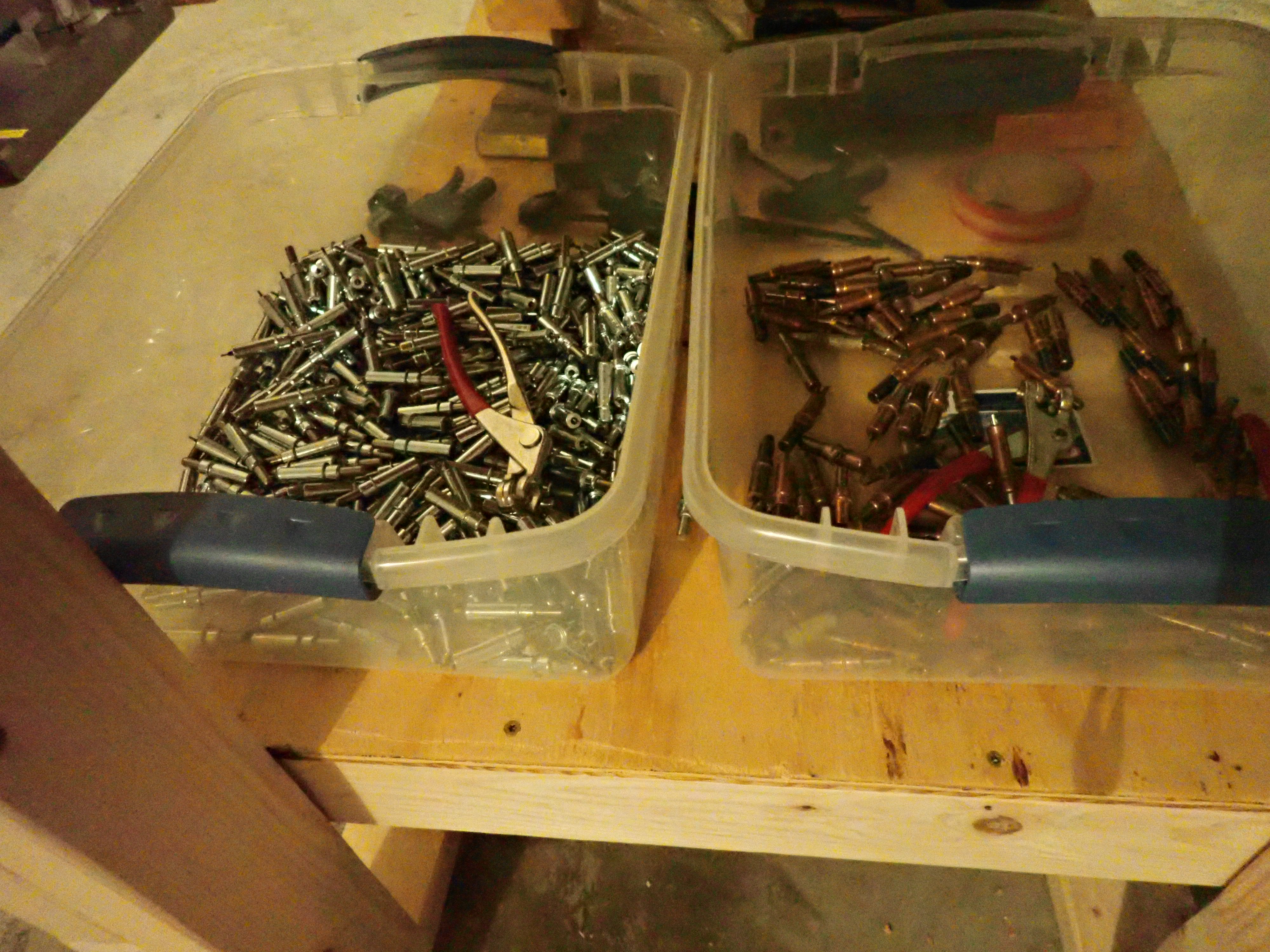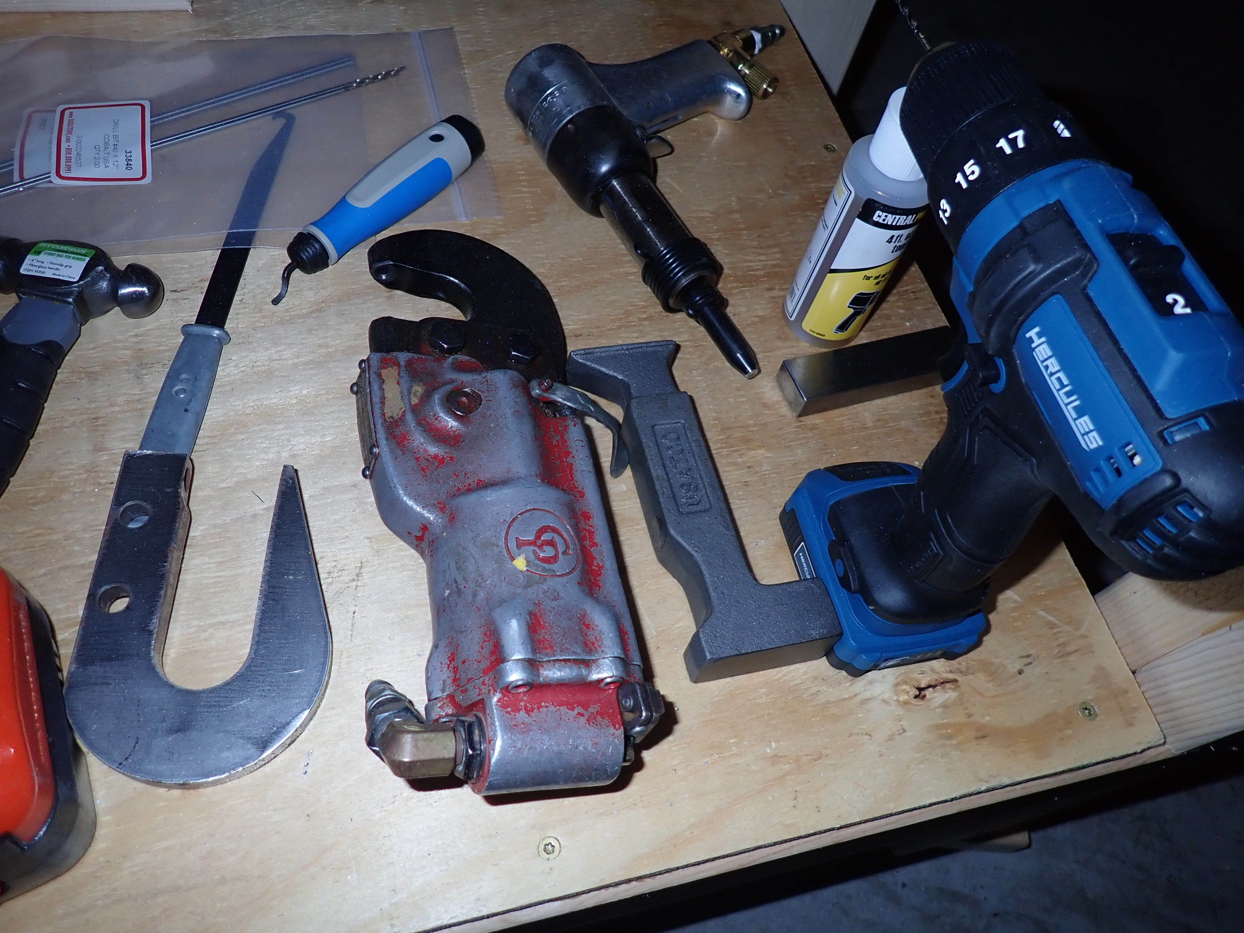 Showing off a few of the essential tools: I acquired a 3X Rivet Gun and a Pneumatic Squeezer off eBay. They look really used but they seem to work just fine. The little bar between the Drill and bottle of air tool oil is a Tungsten bucking bar. It is an amazingly heavy dense piece of metal. I have been told that I will use that 90% of the time over the more traditional bucking bar between the squeezer and drill.
