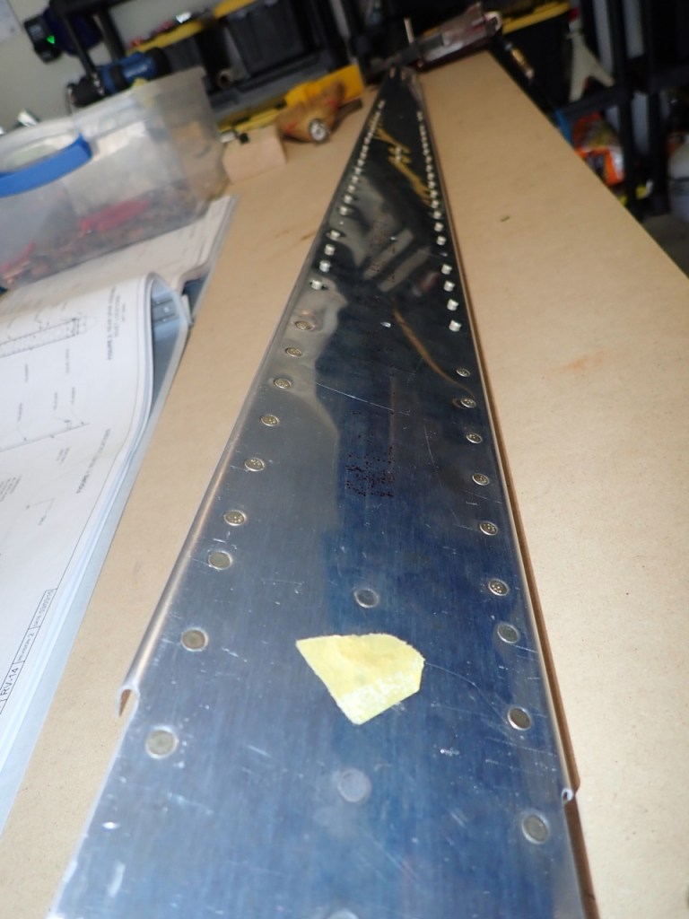 The yellow tape was put there to remind me to not install rivets in those holes. They are the holes that attach the spar to the other structure of the Vertical Stabilizer.