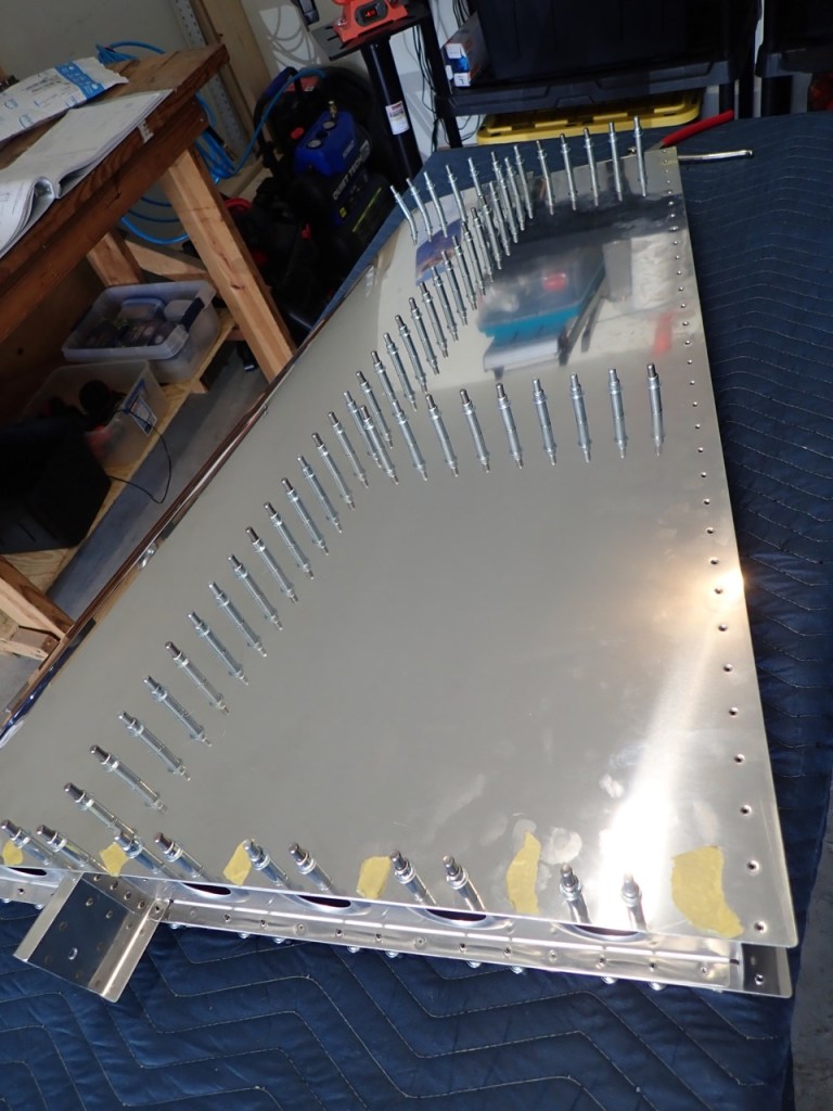 After getting the Vertical Spar framework riveted, deburred, and dimpled, it was finally time to attach the skin one final time. This will be a theme for this build: cleco everything in place with dozens or hundreds of clecos, then take it apart, and then cleco everything back together. Hopefully this is only done once for each section but I believe I had this skin on and off 4 times before getting to the final riveting of the skin.