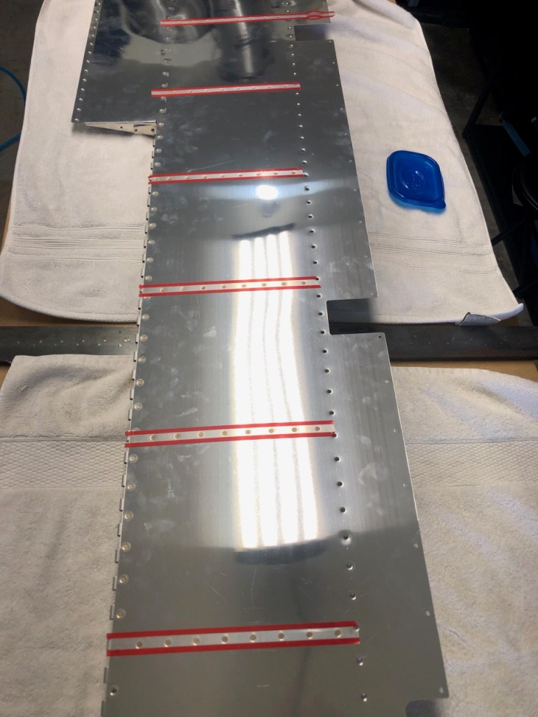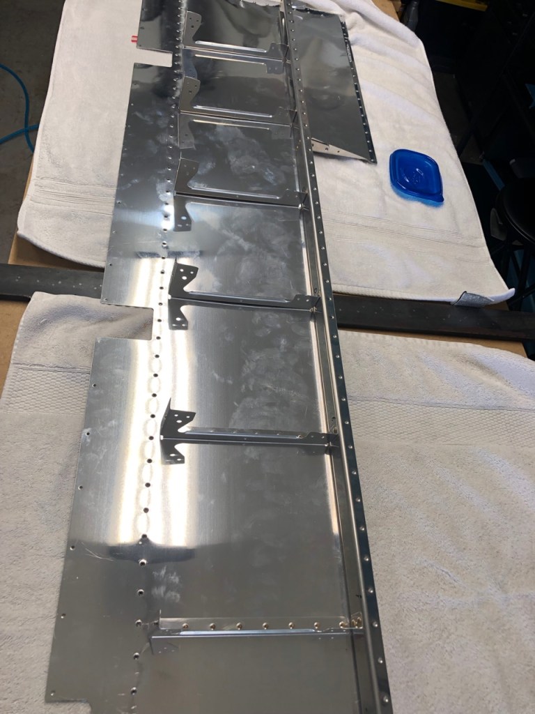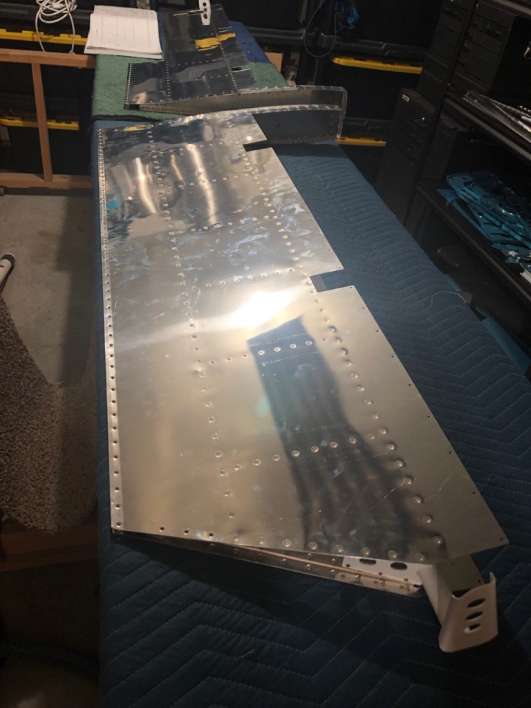 So, I leave things here with skins all riveted, counter balance tips installed, and fingerprints on the shiny aluminum. Next is the trailing edge, assembling the trim tab, and rolling the leading edges.
