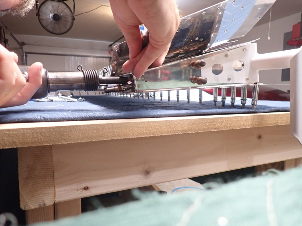The plans suggest a special 14″ long bucking bar should be acquired to get at the skin rivets on the rear spar. It didn’t take all that long to learn another skill but all the rivets were put in nice and flush.