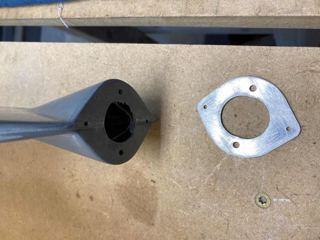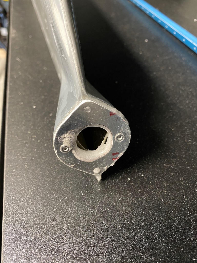 Below is the fairing for the bottom of the rudder. The first step involved fiberglassing and blind riveting a bracket which will eventually hold the rear strobe light.