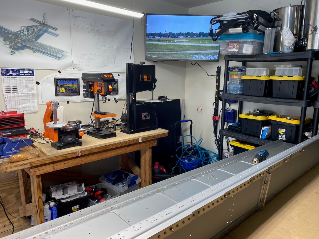 Mid Section update – I had an unused TV lying around so it became a candidate for a shop TV. I can now watch youtube videos of Oshkosh landings while I build.