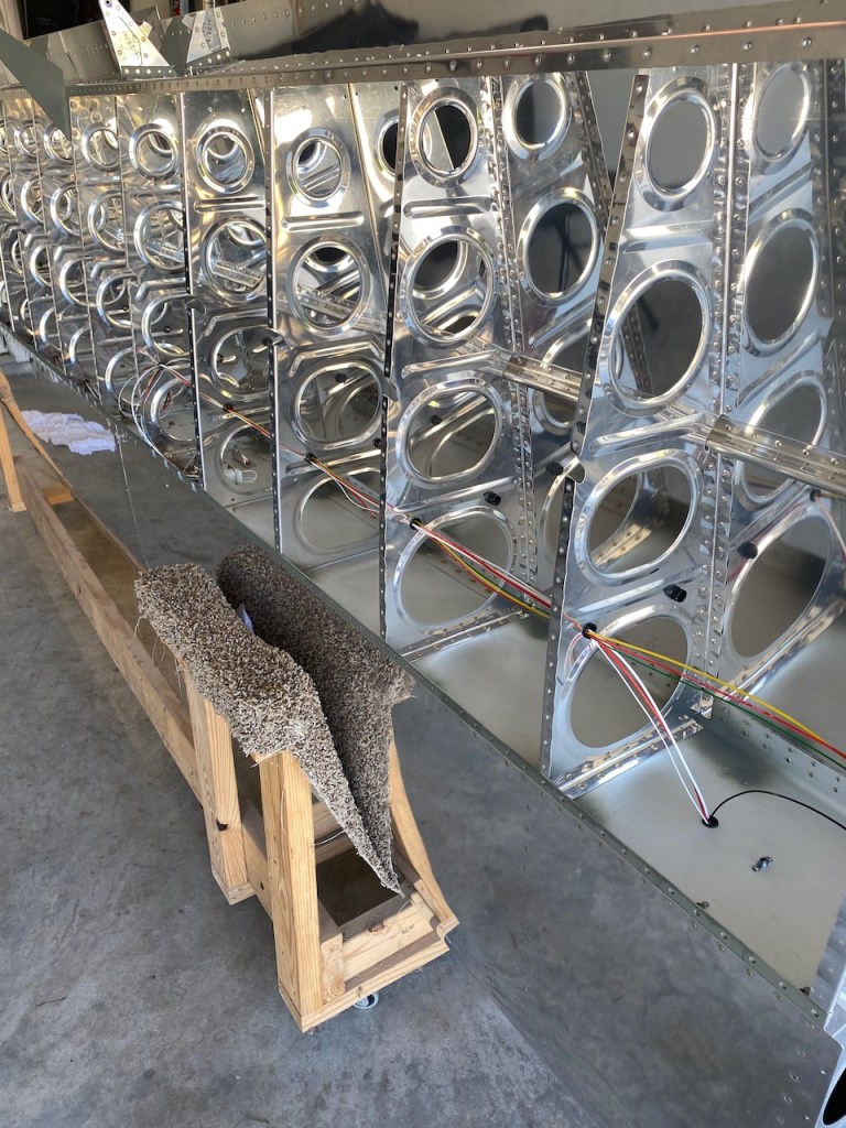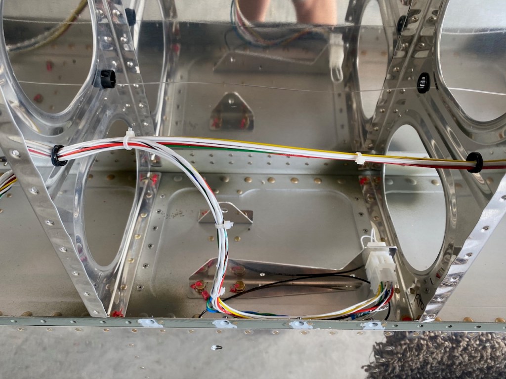 There is not a lot to write about here. This section consisted of installing the wiring in the wings. The wiring is to power the wing tip Strobe and Navigation lights, the landing lights, the Aileron Trim motor (right wing), Auto Pilot servo (right wing), and the Magnetometer (left wing).