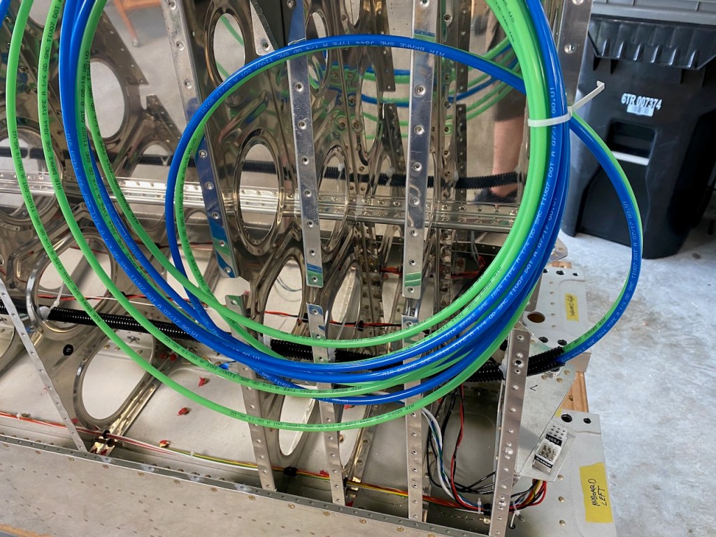 But I did install the wiring for the pitot tube heat. This consisted of a twisted pair of 14AWG wire. I also installed the pitot/AOA airlines which I will describe more later. These are the green and blue lines you see below.