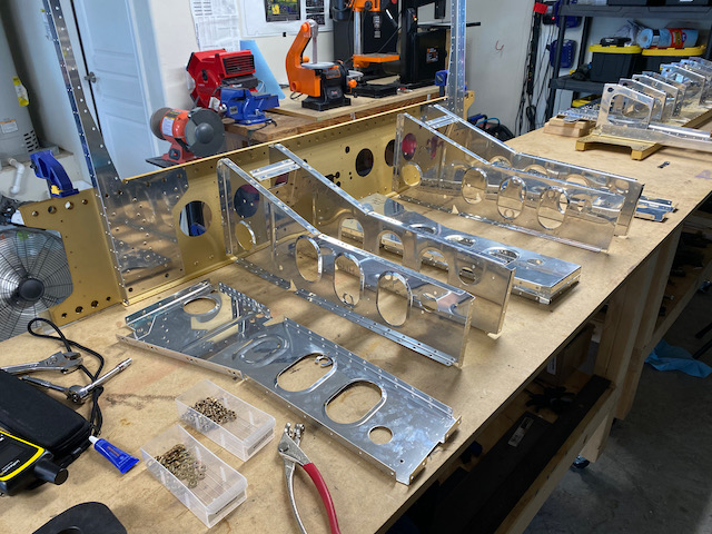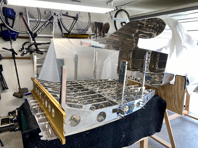 Because of its height, to get to the rivets near the top, or rear section of the bottom skin, the assembly needed to be lowered to the floor and put on a mini workbench. All this aluminum work also requires a bit of carpentry skills.