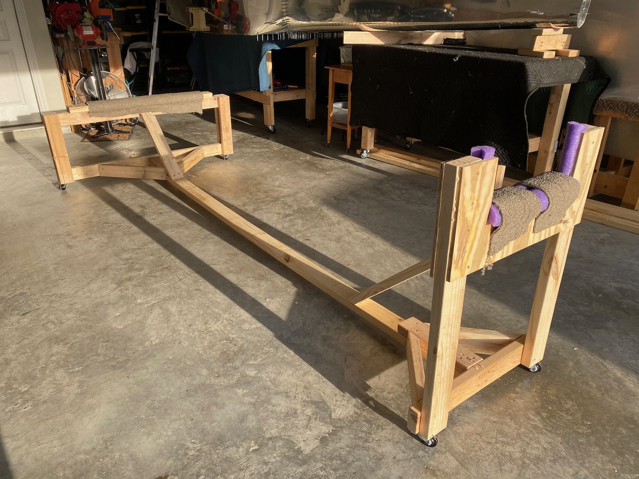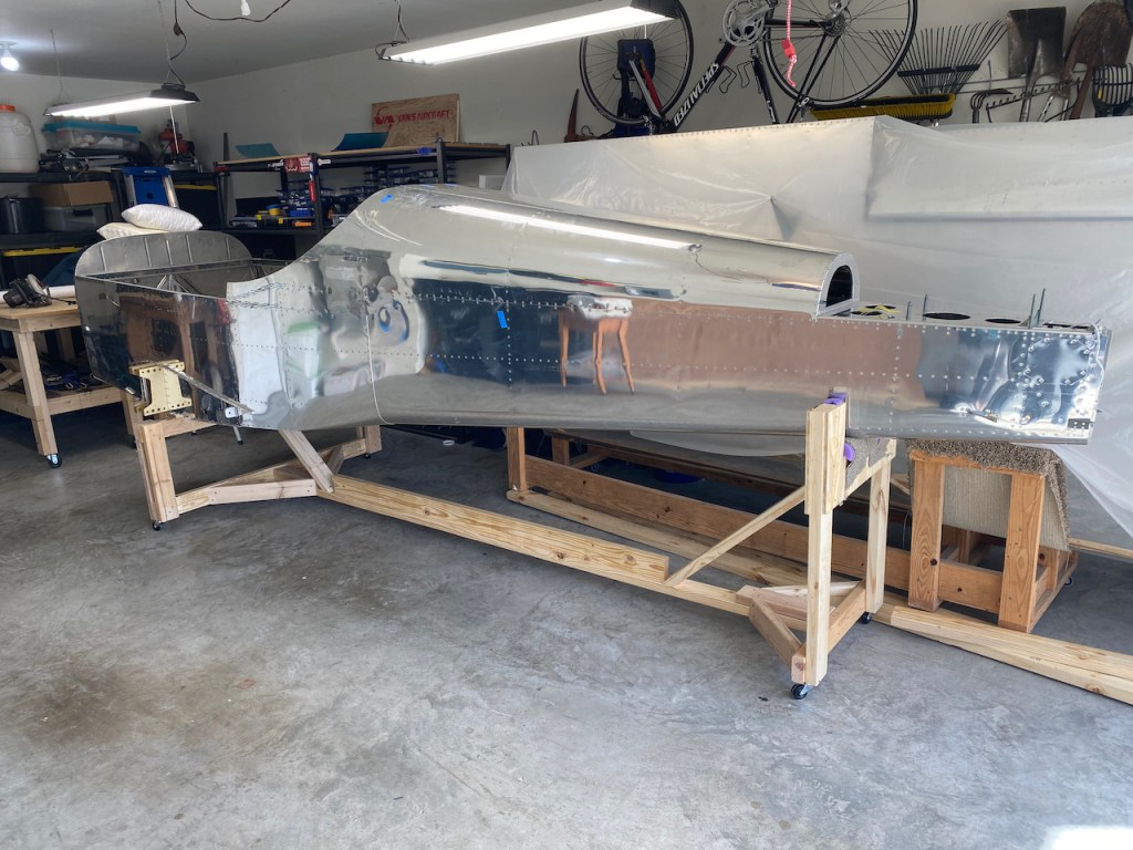 In the meantime, I put together a wooden fuselage stand to hold the entire fuselage until it is mounted on landing gear. The casters will allow me to move it around as needed.