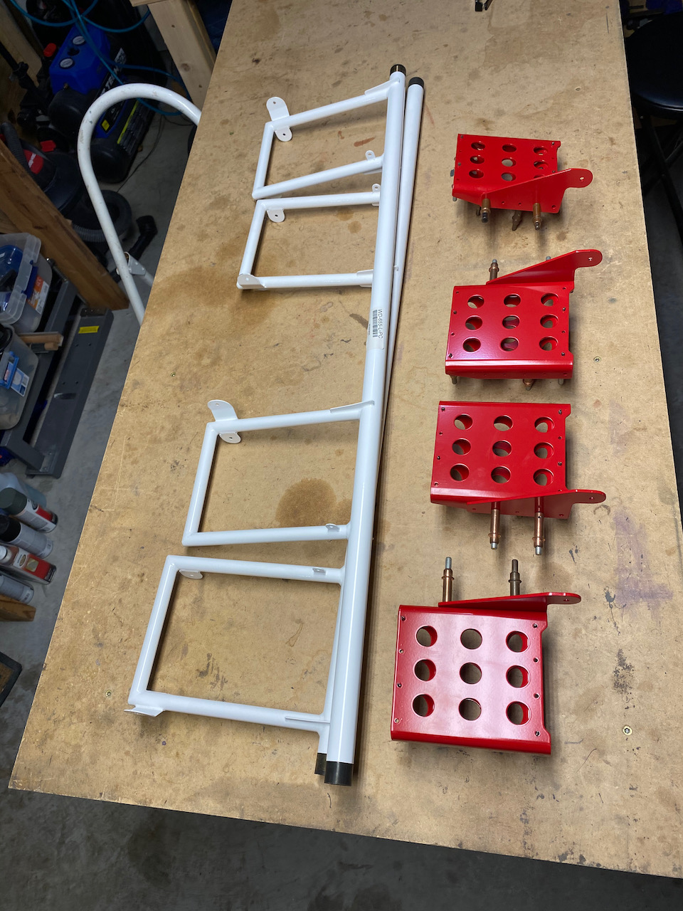I started this section by having the rudder pedal parts powder coated red. I think it will look pretty cool with the white rudder bars and the black floor and side panels.