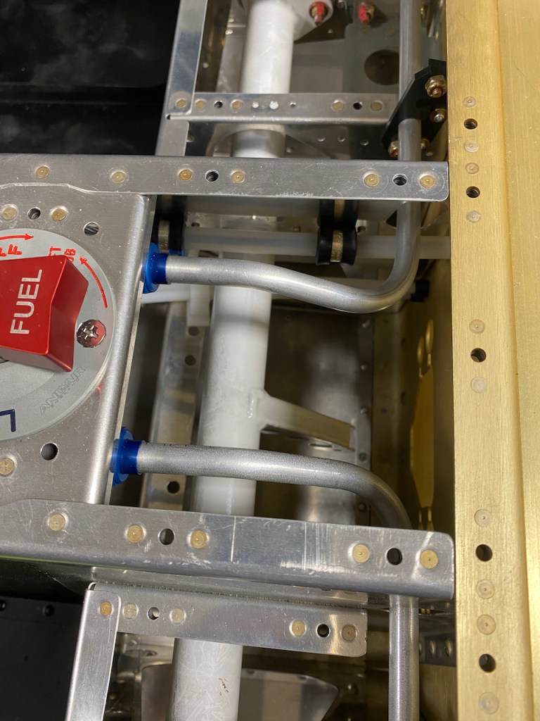 One last step in this section is putting 4 bolts into an adele clamp which holds the plastic tubing that covers the rudder cable as it passes up into the cabin. This was the single most PITA step of the build so far. It took 4 hours to put in 4 bolts and nuts. I will not try to relive this and describe how it went but I eventually learned that safety wiring the adele clamps made them stay closed enough to attach the nuts.