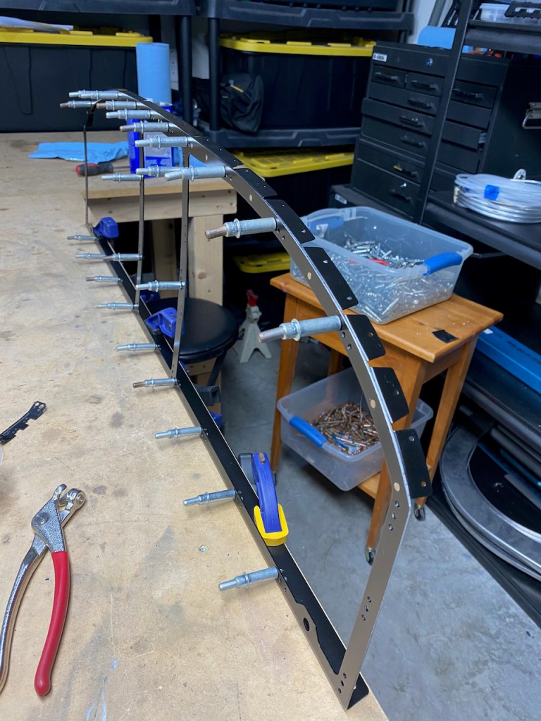 The remaining part was the framework that will hold the eventual and very pricey panel. This part was riveted to the trapezoidal shaped pieces seen in the photo above.