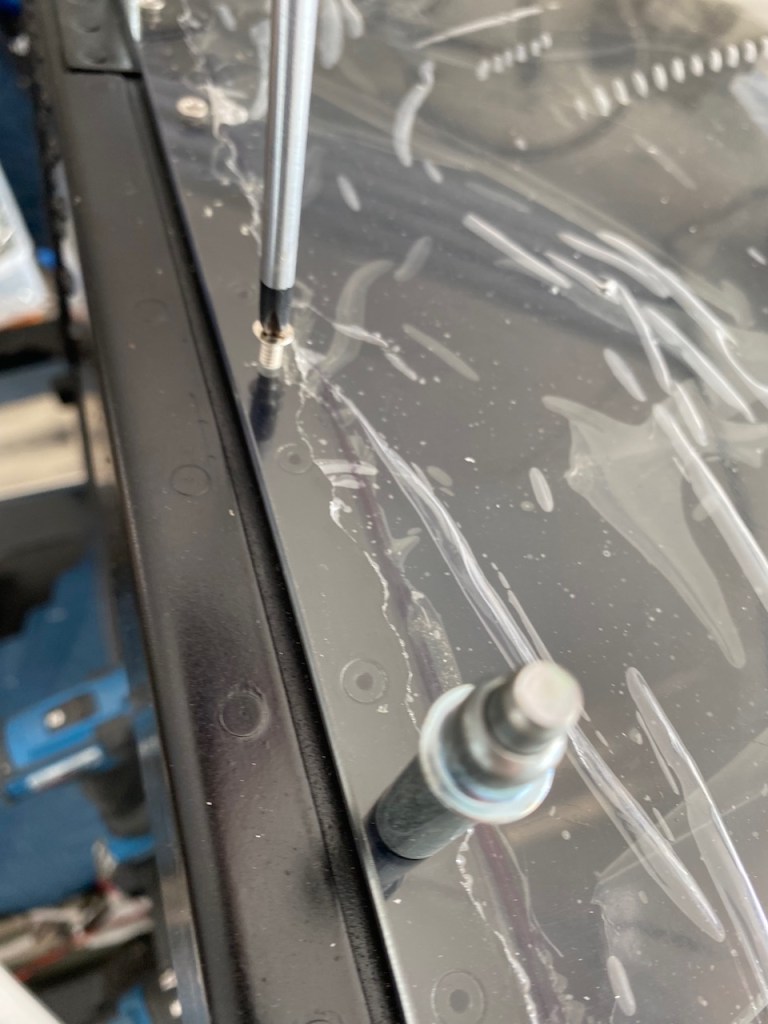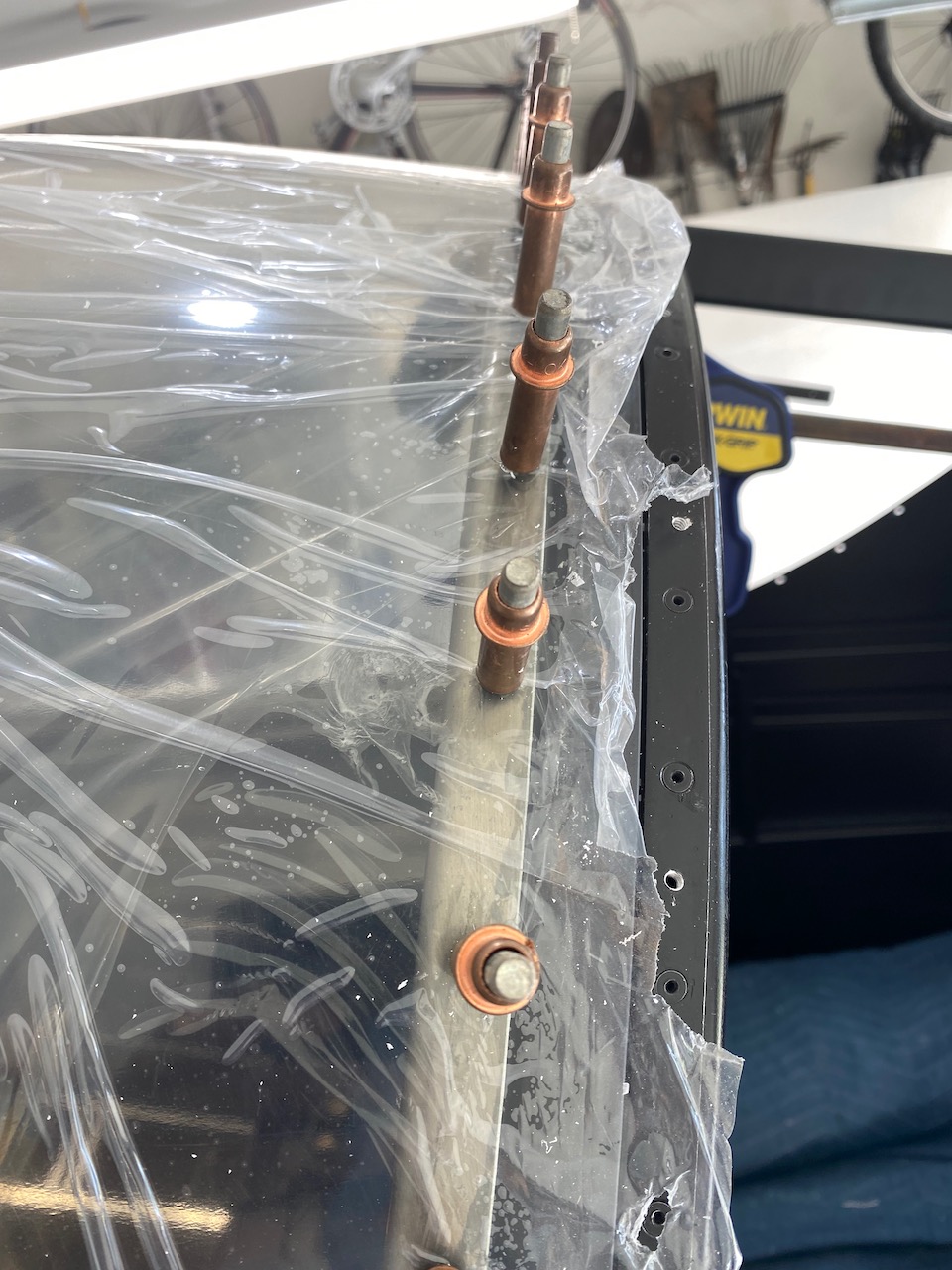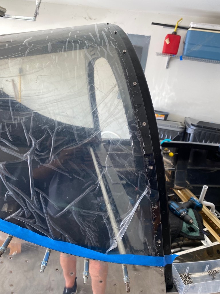 The basic steps were to drill through the plexiglass with a plexiglass-bit, then drill in the same hole into the metal (roll bar or fuselage skin), then enlarge the hole, then thread the holes in the roll bar. Screws were temporarily inserted to hold the window in place.