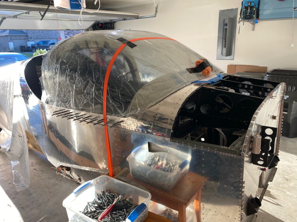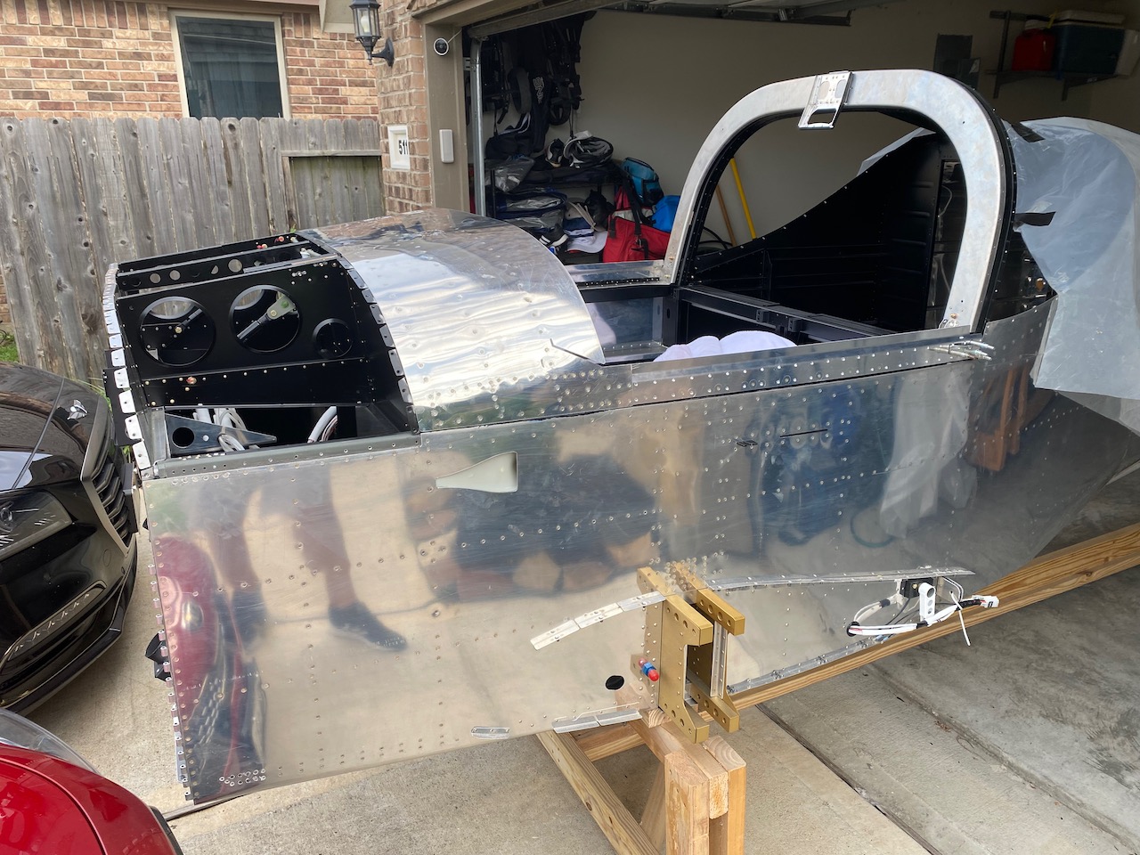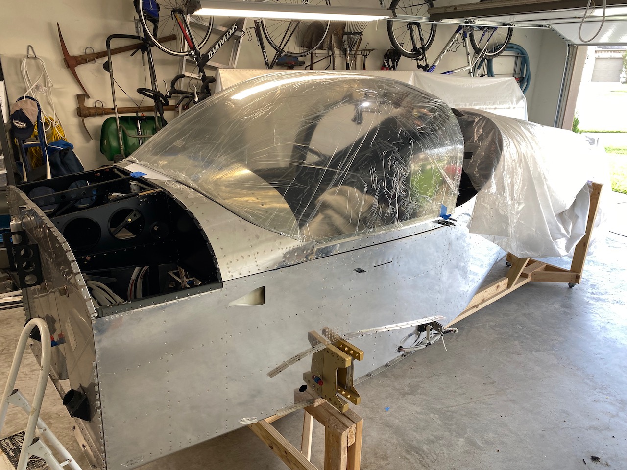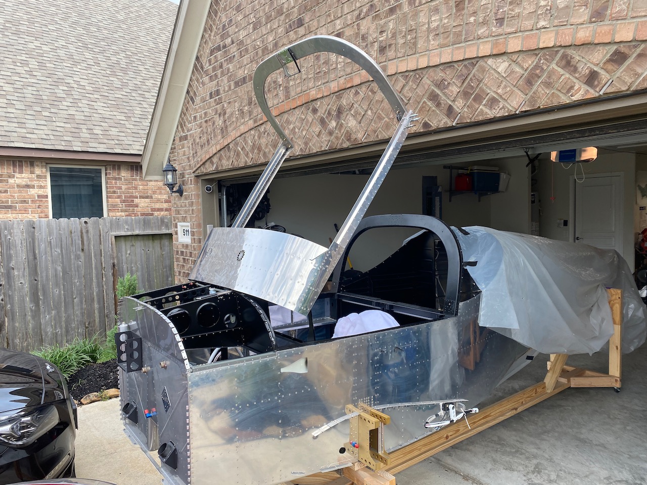 I needed to wheel the fuselage outside the garage to get the canopy frame attached. It swings up too high for the garage ceiling so I will deal with that another day. For now, it appears to line up very well. No unpleasant, painful, or heart rendering things happened.