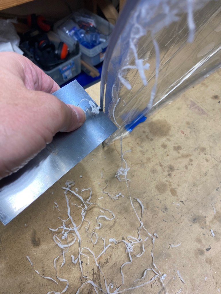 Trimming was very slow. I used a furniture scraper to shave plexiglass off the trailing edge one micrometer at a time. This took over 9 hours to do leaving much plexiglass shavings all over the shop. The reason I went this route because I didn’t want to cut too fast or slip with a power tool or dremel tool. The canopy is worth over $1000 (my guess).