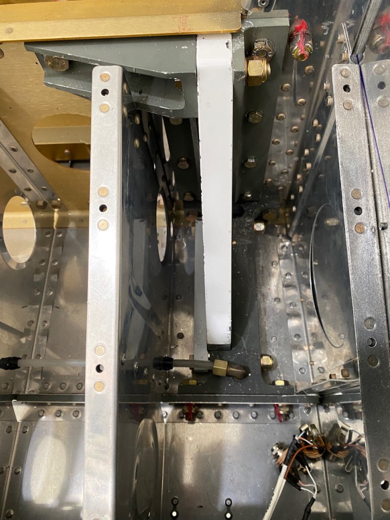 Then the process of inserting the main gear legs through the bottom of the fuselage and securing it between two heavy aluminum blocks previously installed. It was secured to the top with a large bolt.