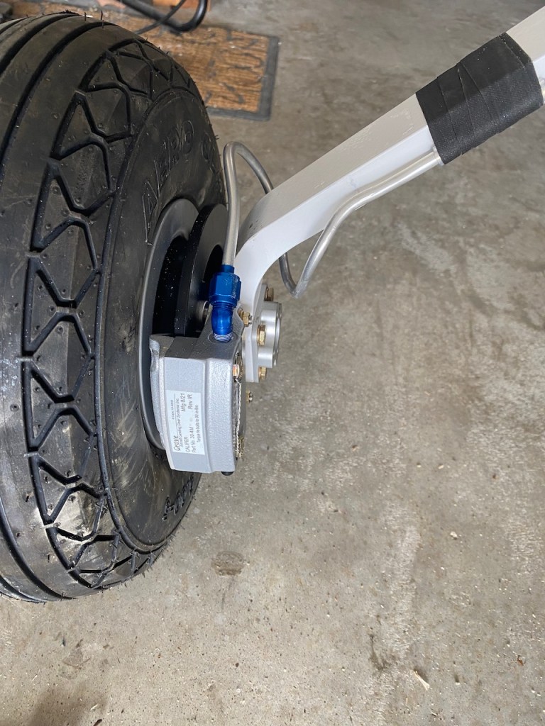The last step in this section involved attaching the disk brake calipers to the main wheels along with adding the aluminum tubing used as brake lines. The black friction tape holds the line to the gear strut but this will eventually be covered with a fiberglass fairing.