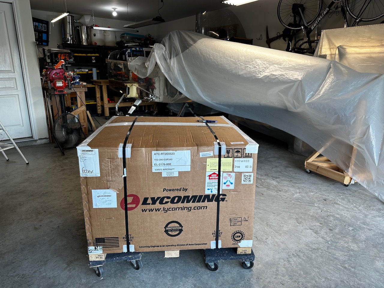 This was the big step: receiving and installing the engine. I ordered a Lycoming IO-340EXP119 Thunderbolt engine from Vans in Dec 2021. The original delivery date was sometime in October 2022 but I never expected, or wanted it, until later. It finally was delivered in early July which turned out to be perfect timing because I was ready to install it immediately.