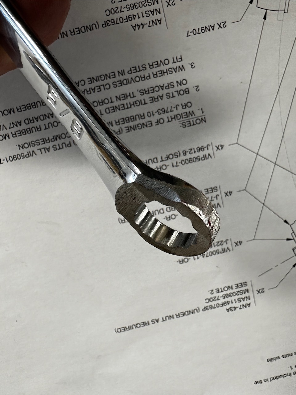 A 5/8″ wrench was sacrificed to the tool gods by grinding down and thinning it out a bit in order to reach some engine mount bolt heads.