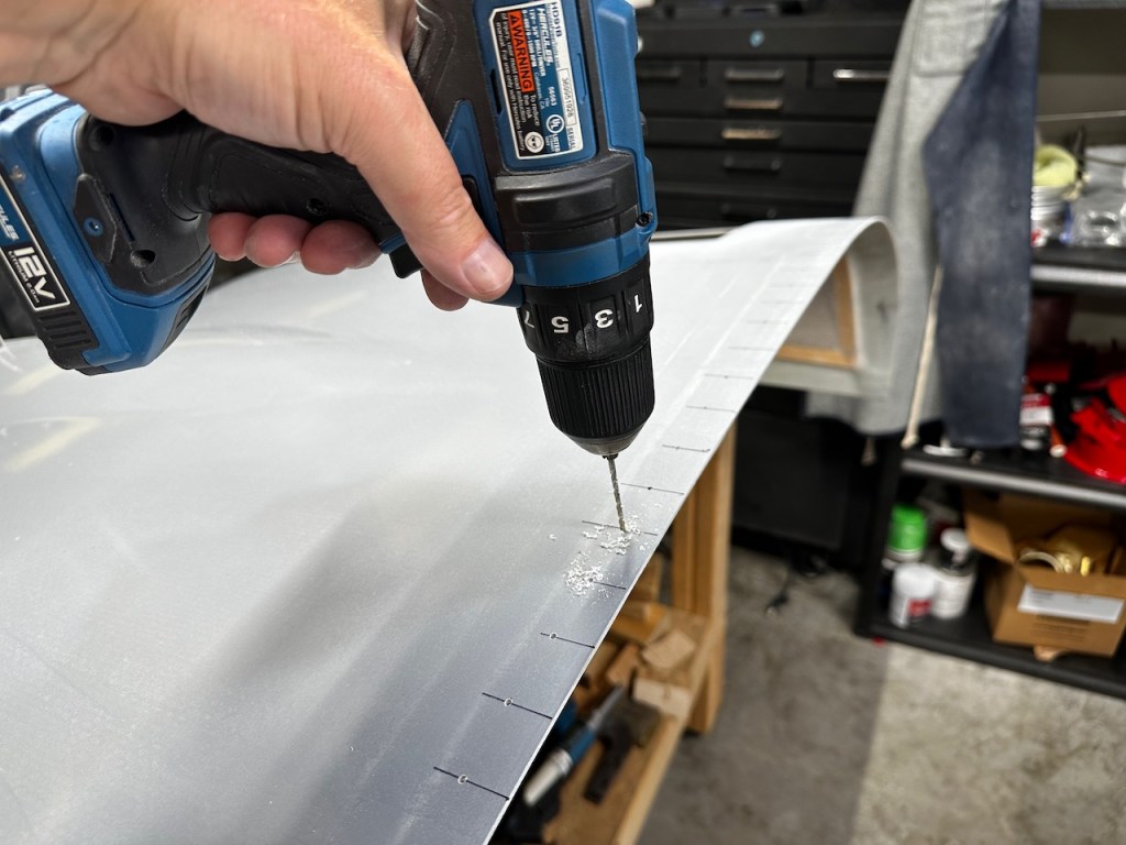 After trimming, holes were drilled to rivet the piano hinge to the sides and rear of the cowling.