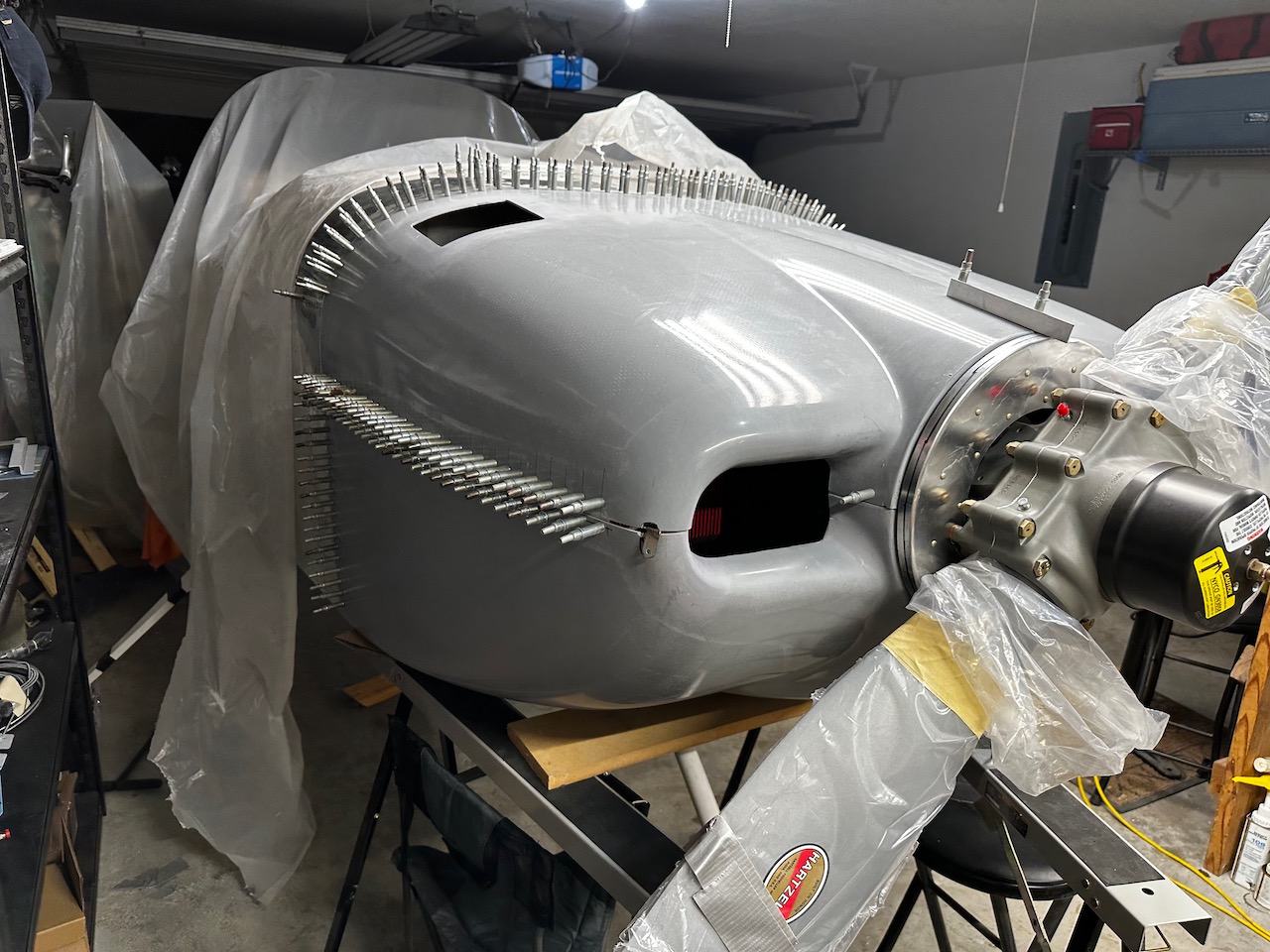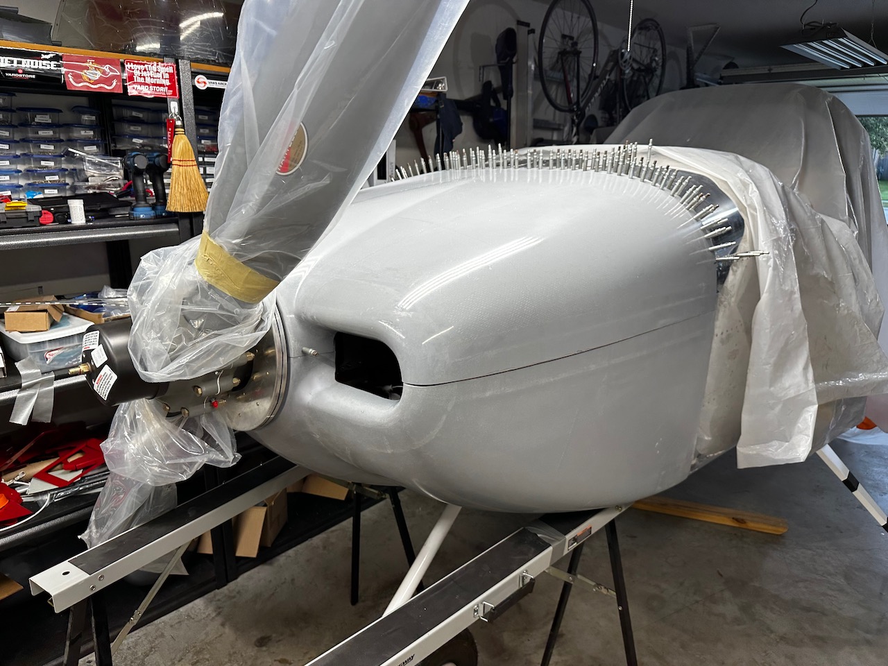 There needs to be a 3/16″ gap between the cowling and the prop spinner backplate. This is the reason for the installation of the prop at this point. Once I am satisfied that the cowl is fixed in place, I can remove the prop which I did.