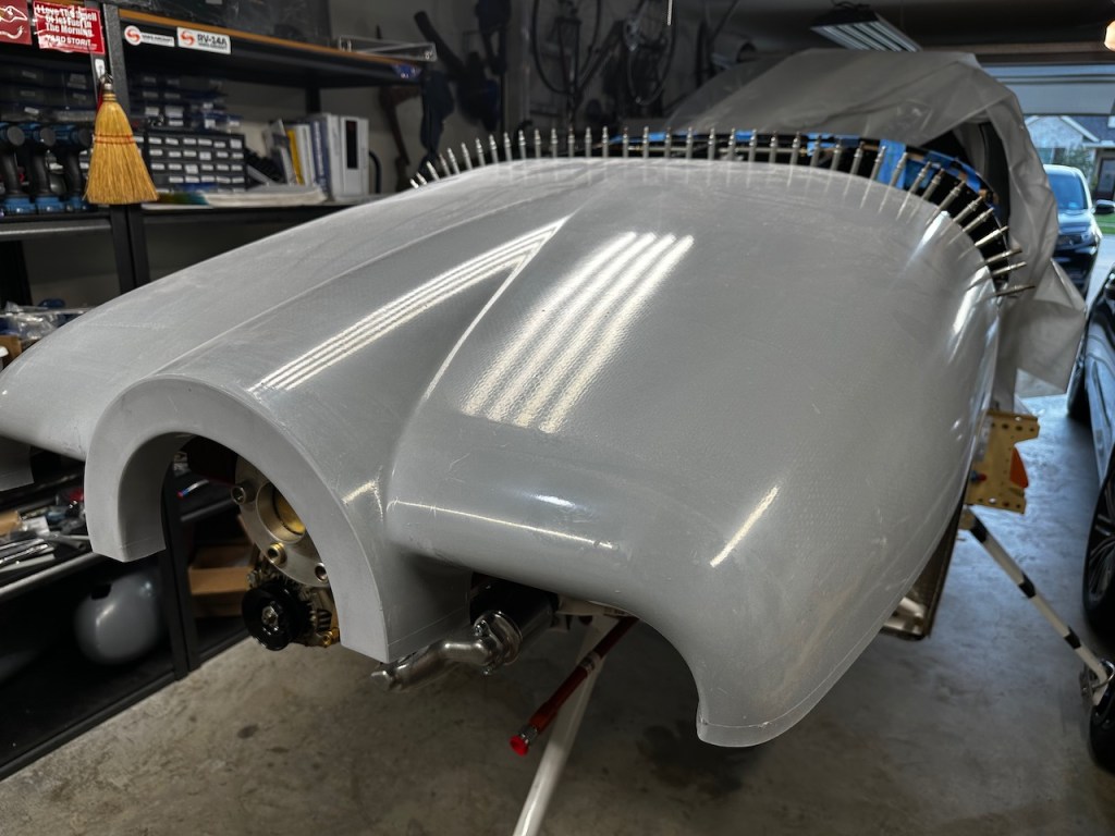 This is the bottom cowl held on with tape in preparation of drilling the holes for the piano hinges.