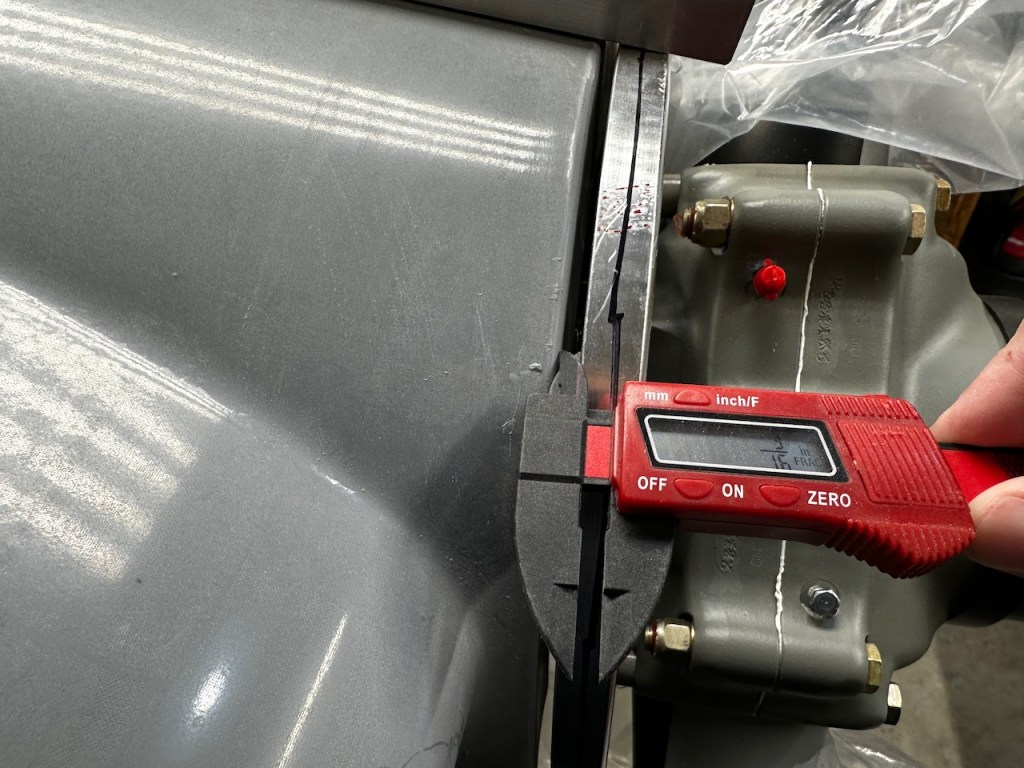 Cowling is held in place with clecos until riveting. The gap between parts should be 0.050″. I think I have a bit too much here that I might fill in by “scarfing” the edge. The front lip outboard of the inlet is not lining up either. Epoxy/micro beads plus some bondo will take care of that.