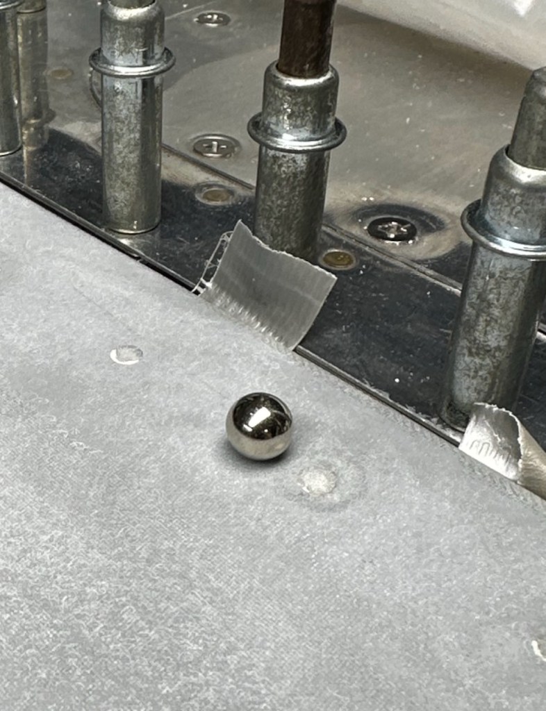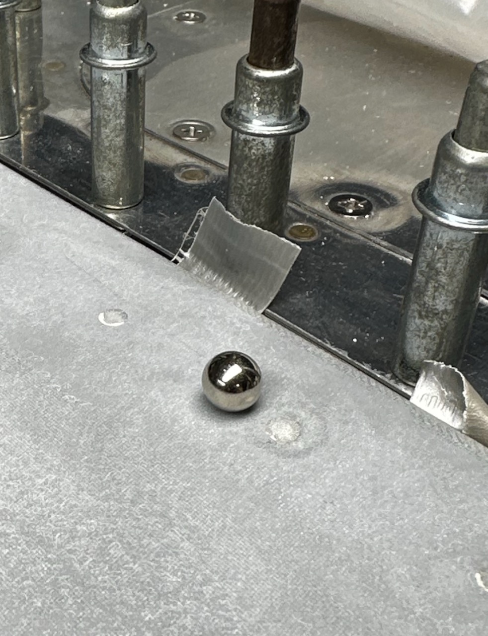 …and then the cowling is placed on the airplane, and a ball magnet is dropped into the general area. The magnets are so strong, the ball had no issues finding where it was supposed to be. By the way, you can see in the following photos where I filled in with epoxy and flox where the holes used to be holding the hinges.