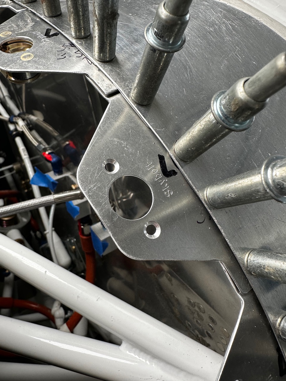Flanges that hold the Skybolt receptacles are cleco’d and eventually riveted to the firewall. In my case, I used 17 around the perimeter of the firewall I had to space them out in order to not cause interference with the engine mount. The top 7 were spaced 2 3/4″ apart, a couple were 3″ apart, and the remainder were 3.5″ apart.
