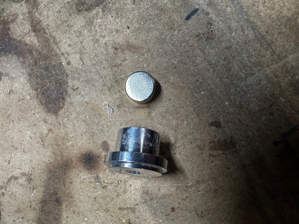 In the steps that follow, I needed to drill into the fiberglass cowling where the Skybolts needed to be installed. The trick for alignment was to use magnets. What is shown below is an adapter and a very powerful barrel magnet. This is taped to the flange….