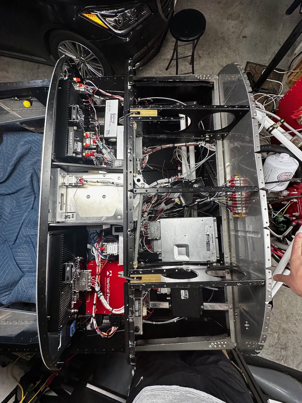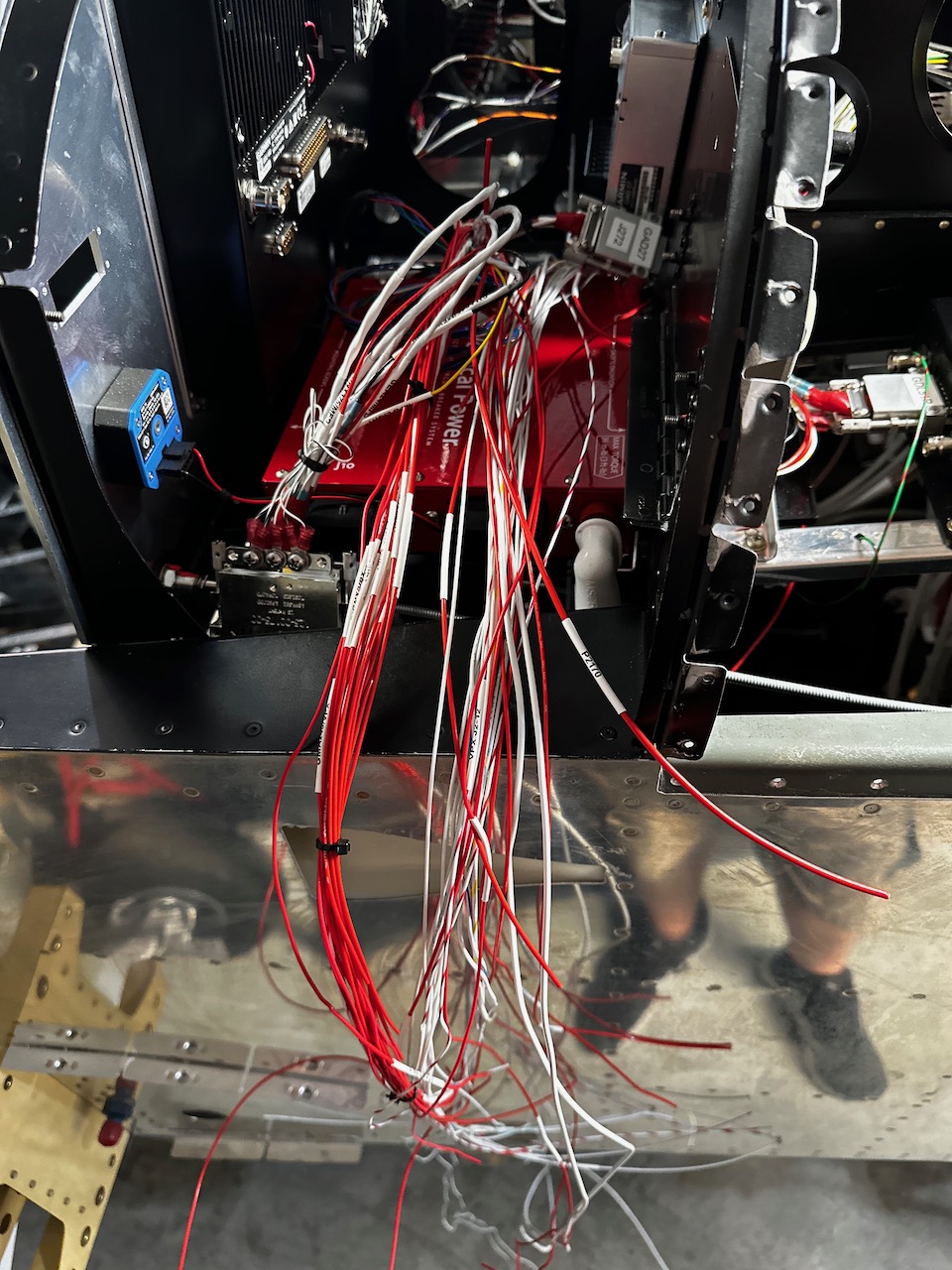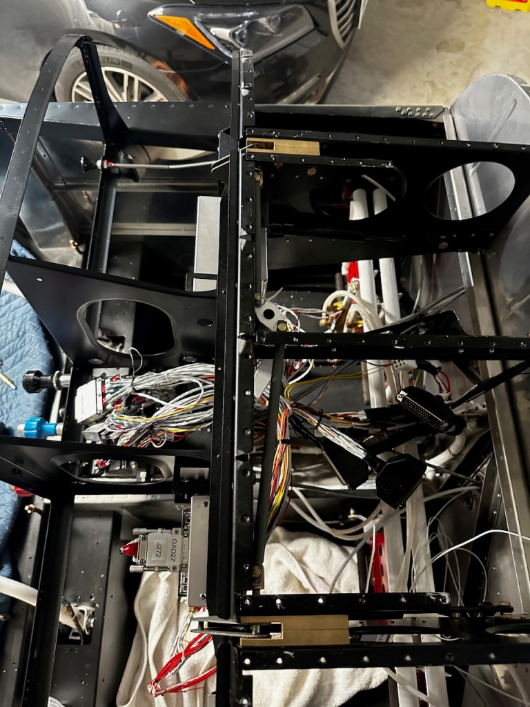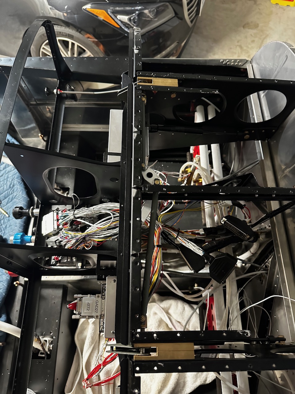 About a dozen Garmin boxes were installed into various places in the panel. The hope was that the harness connector would attach to the boxes in the right place with the right amount of service loop. Below is the GAD 27 which controls the flaps, lighting, and trim motors.