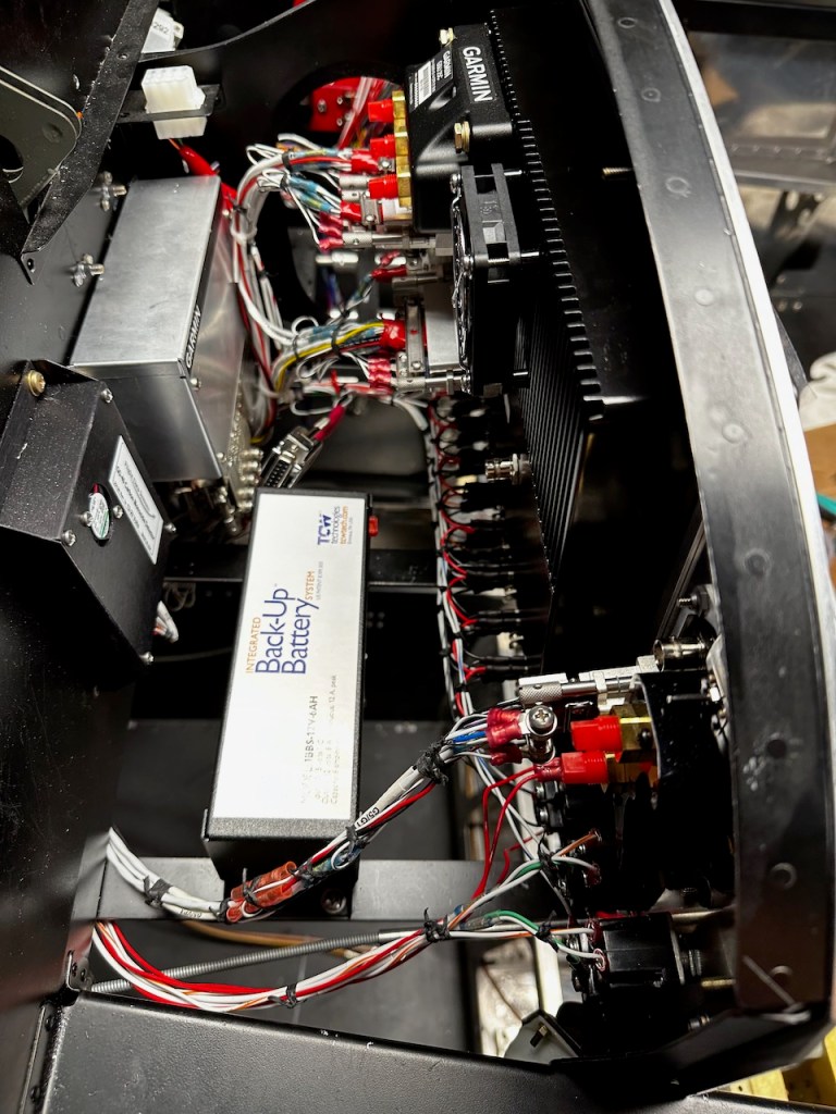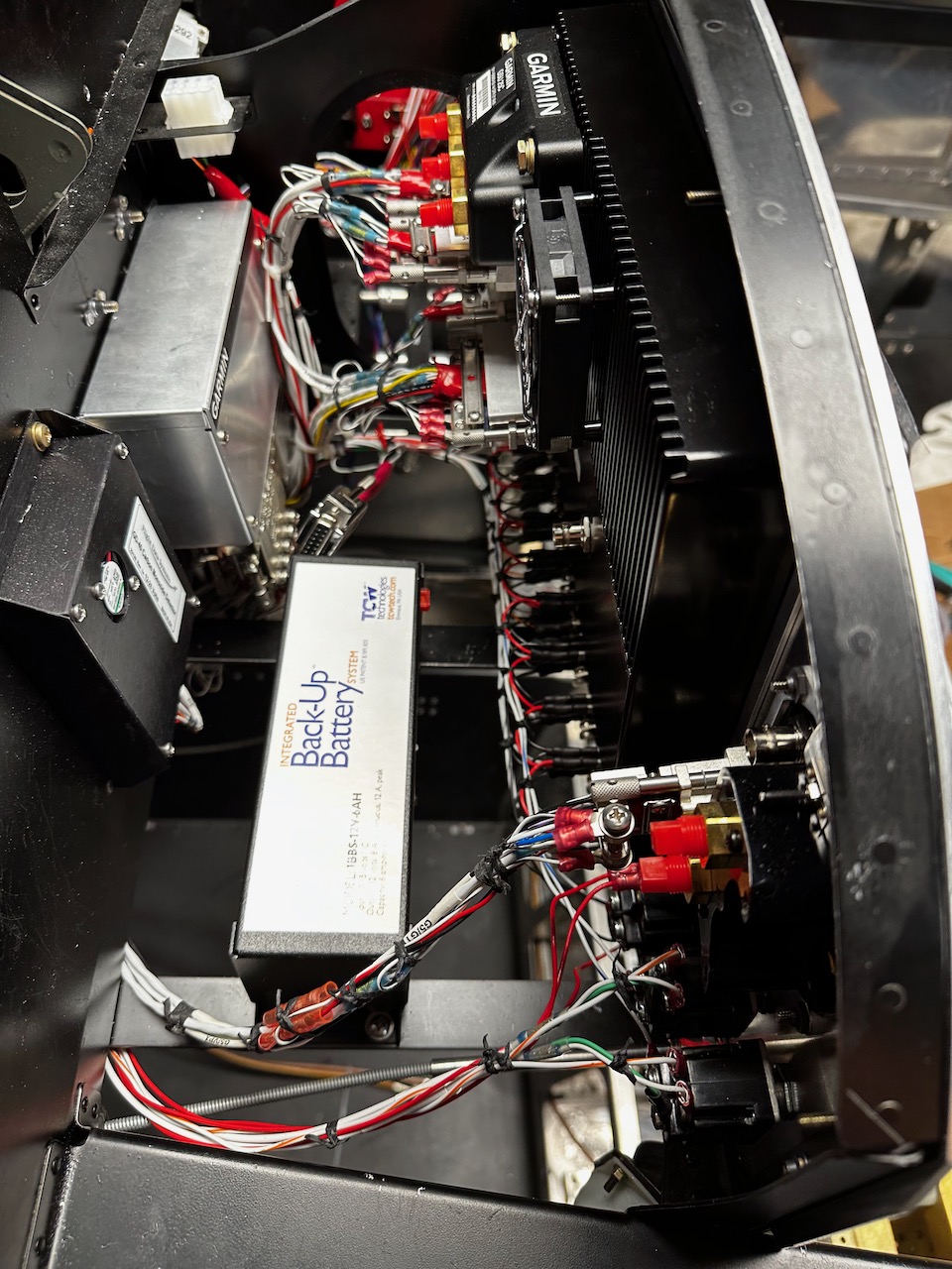 Below is behind the pilot side screen. The TCW Back-Up battery is there to provide about an hour’s with of power to the panel if the alternator fails.