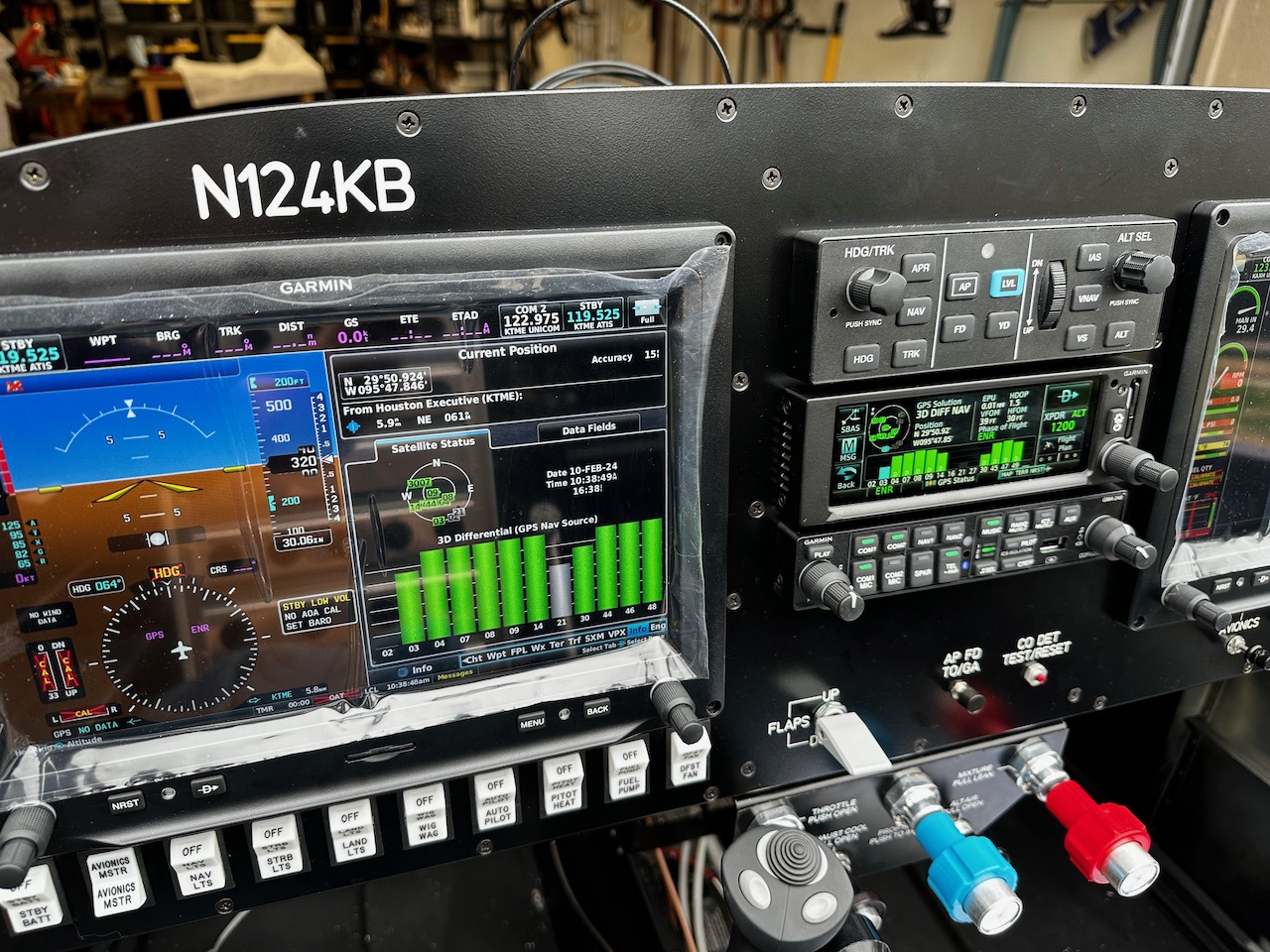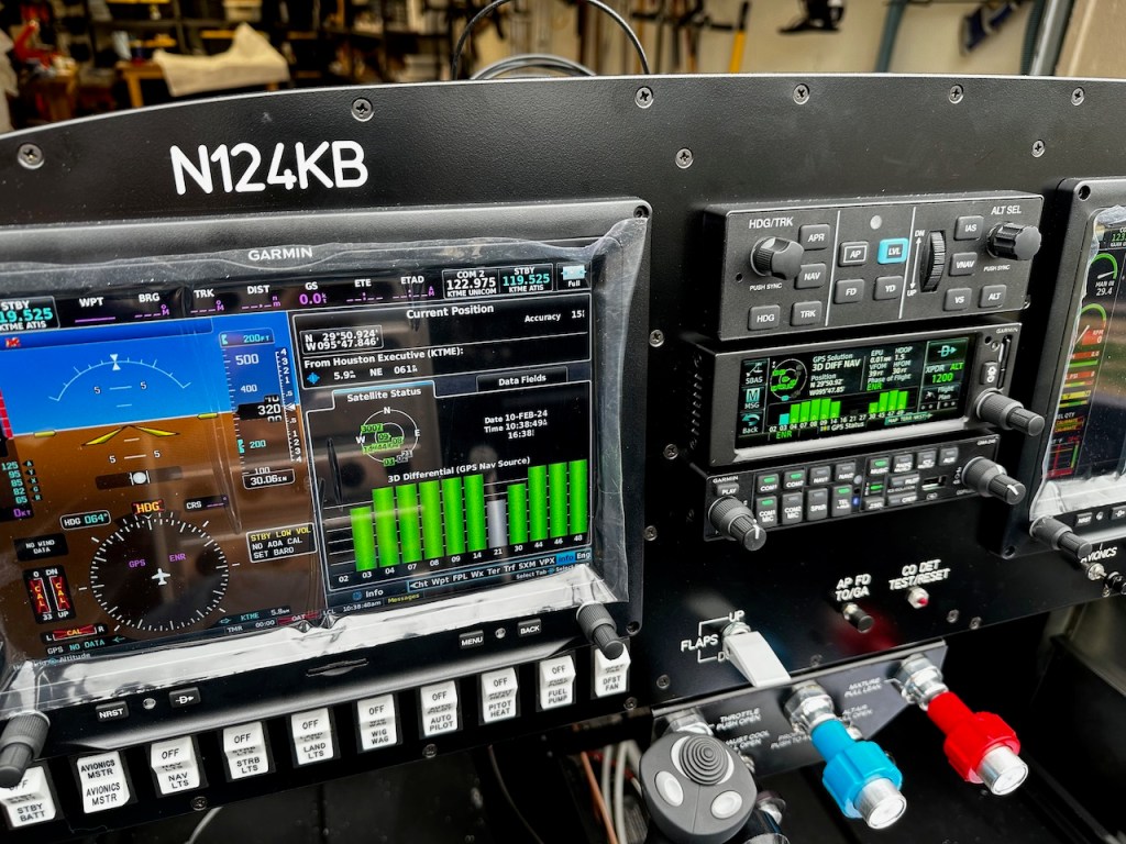 The airplane was pulled out of the garage to let the GPS antenna’s find satellites. The green bars meant something good was happening.