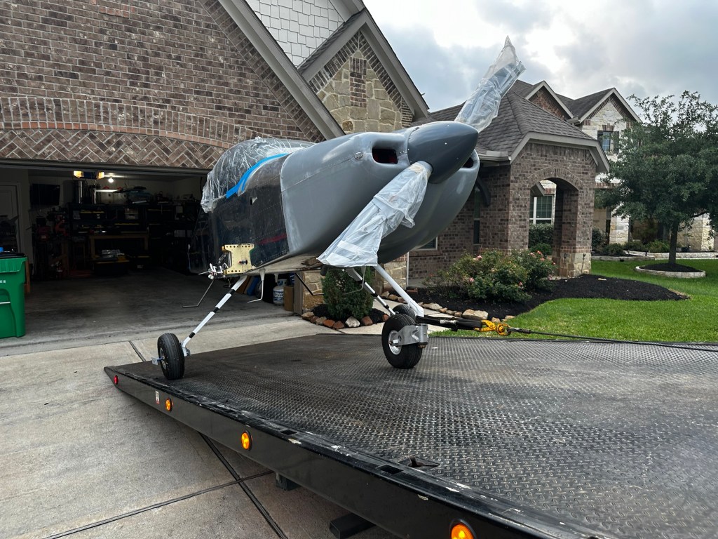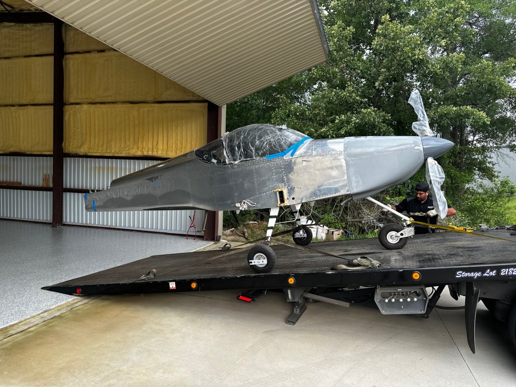 I hired a local tow truck operator, and I couldn’t have been more pleased with how they loaded and strapped the airplane to the flat bed. The trip to the airport was somewhat white knuckled seeing all this work on a flat bed and going up I-45 but it was mostly a non-event.