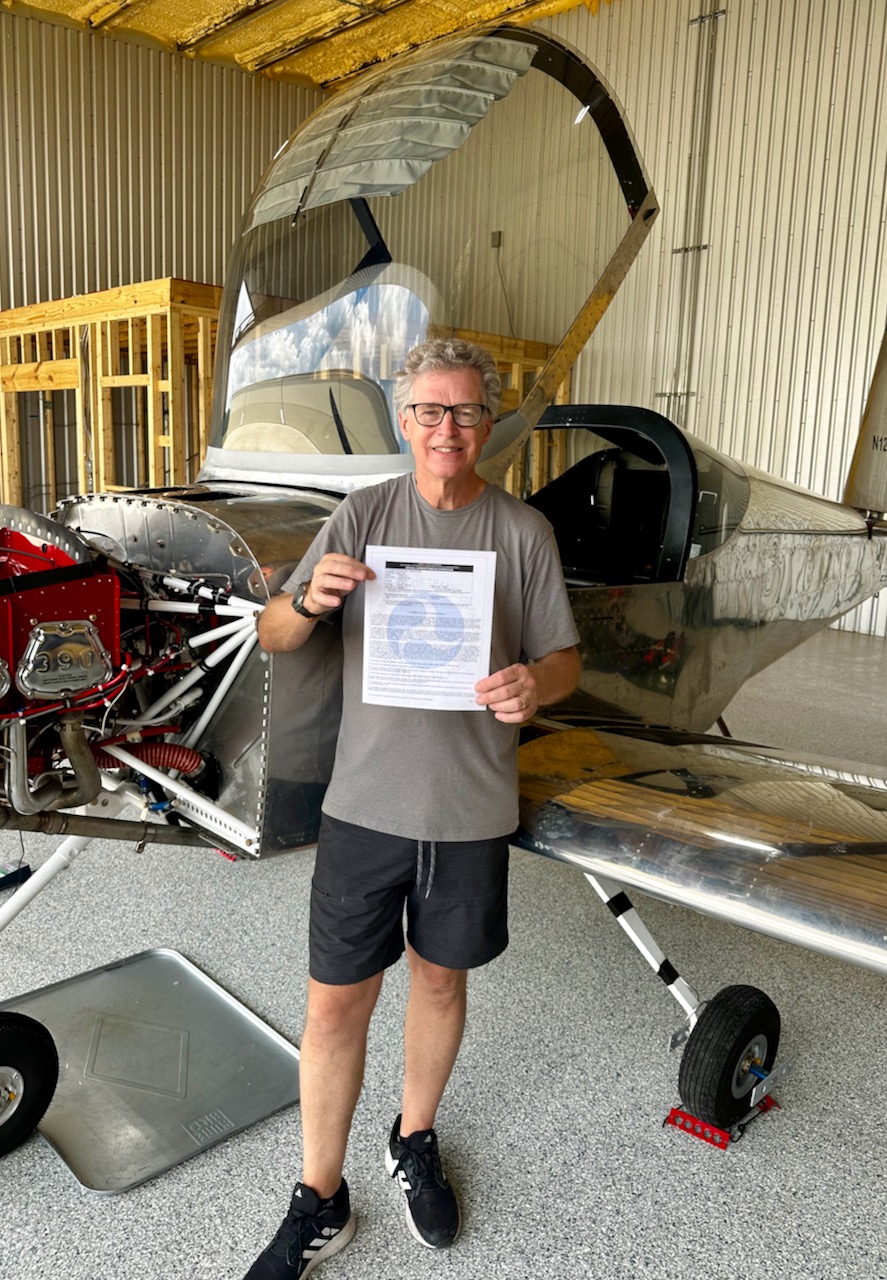 On Aug 4, 2024, a Designated Airworthiness Inspector made a visit to the hangar to look over the airplane and ultimately issue an Airworthiness Certificate. The process went very smooth although I made sure everything was organized and ready. I was proud to finally say “I built an airplane!.